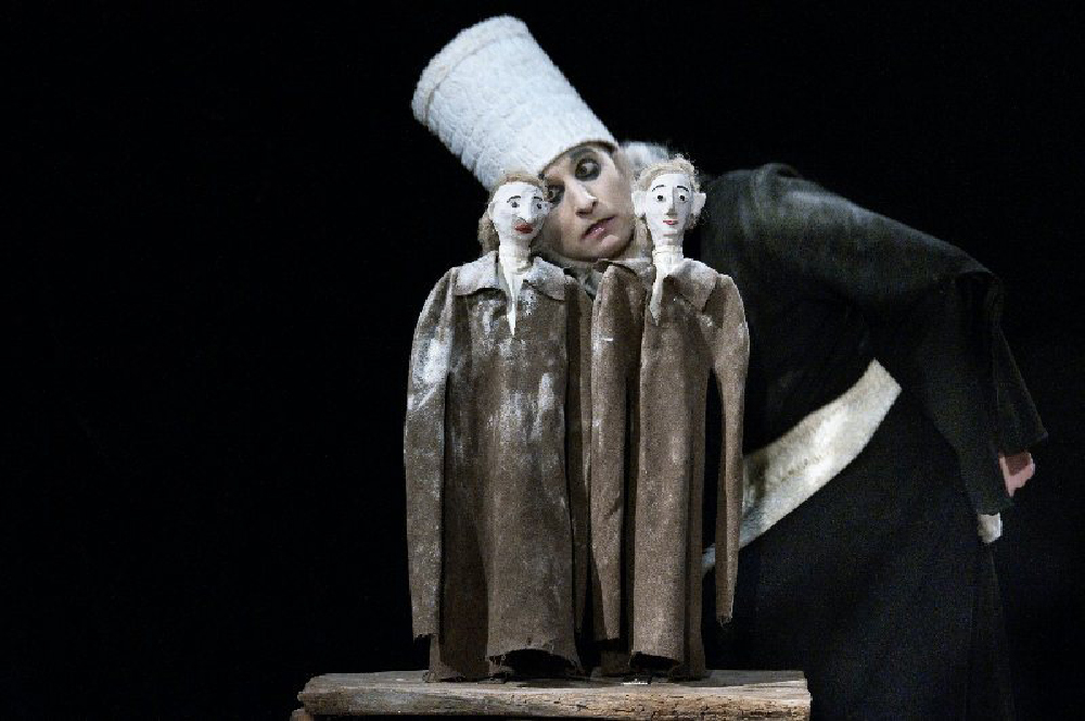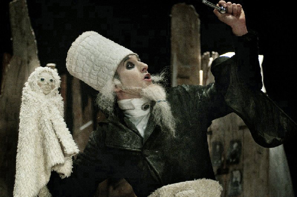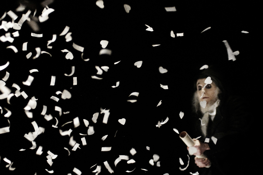 E’ davanti ad una platea vuota che prende forma la figura della nostra riscrittura scenica, quella del becchino. Una figura dal trucco marcato, pallido di cipria, l’ombretto che marca le occhiaie, con una barba finta di vecchio in un cappotto nero… ohibò il becchino del teatro non può essere che pieno di finzioni. A lui il compito di cancellare le tracce della tragedia, di raccogliere i feticci dei personaggi, di seppellire i loro desideri, i loro pensieri, i loro sogni, di cancellare i segni del loro passare perché la sera dopo li lascino come se non avessero mai percorso quella strada.